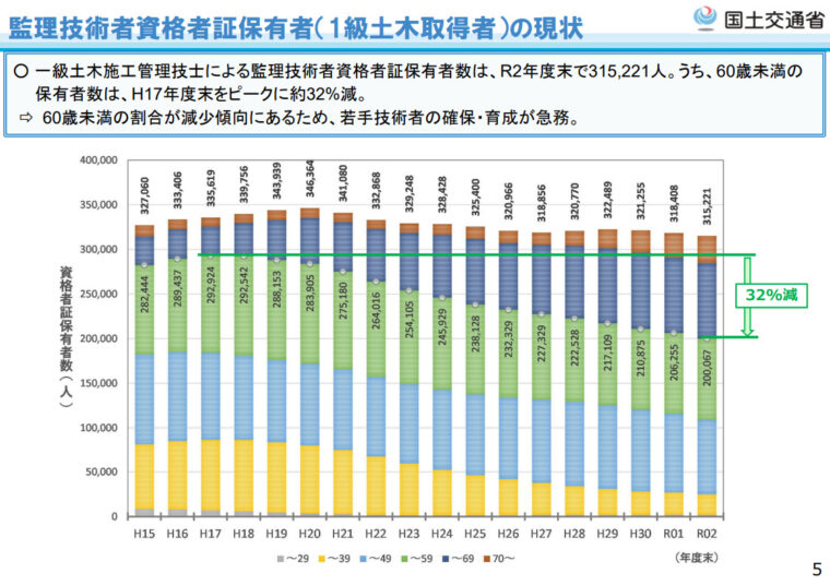 国土交通省の調査では、令和2年度時点で、60歳未満の監理技術者数(1級土木施工管理)はピーク時の平成17年から32%も減少しています。