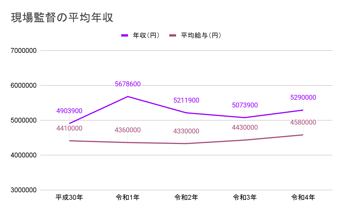 過去5年間のデータをさかのぼっても、現場監督は500万円以上の年収が見込まれること、そして日本全体の年収よりも高い仕事と考えられます。