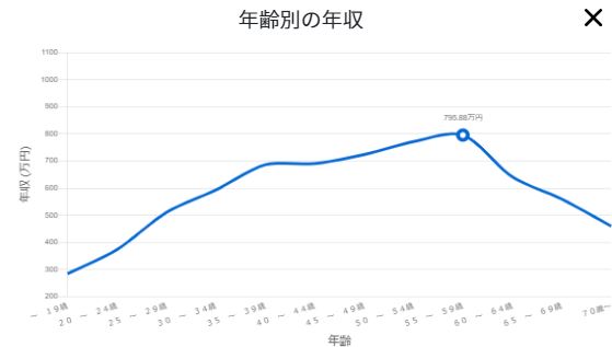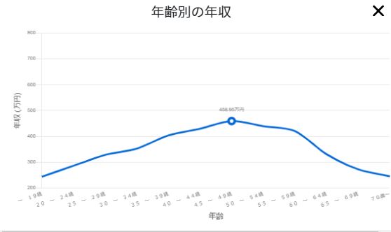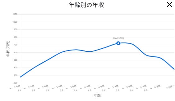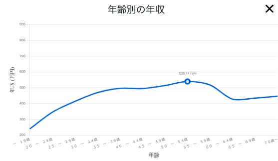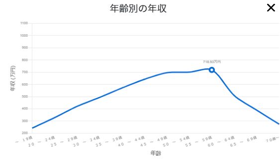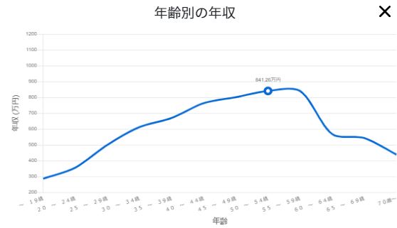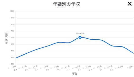 全国の平均年齢は47.2歳ということから、平均年齢で年収のピークを迎えることが推察できます。