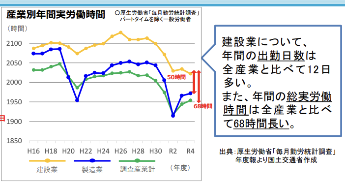 国交省も、2017年のデータでは建設業の年間労働時間は全産業より336時間(42日間分)も多いと公表しています。